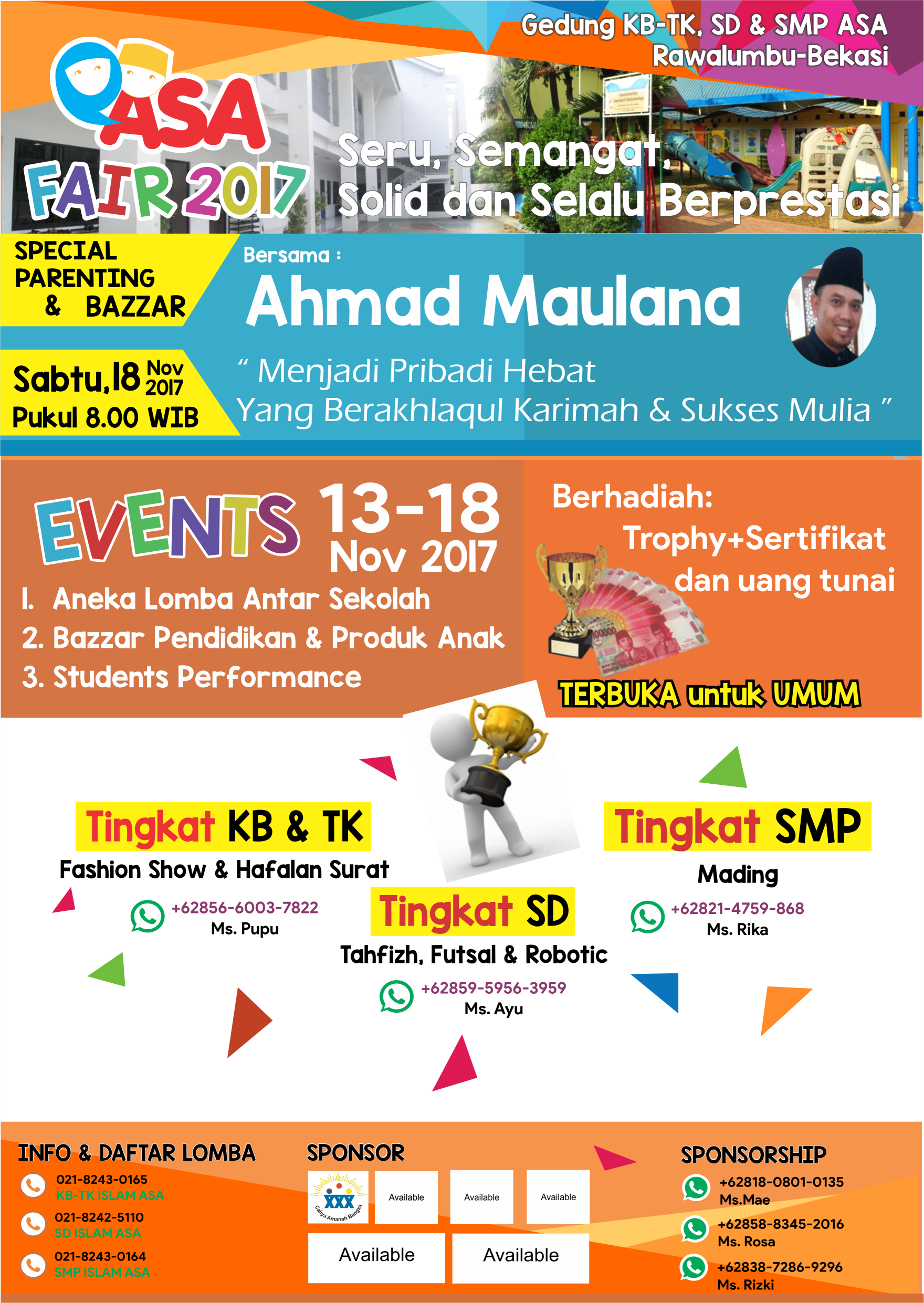 ASA Fair 2017 ini ada lomba hafalan surat pendek Al Qur'an dan Fashion Show untuk kategori TK. Tak kalah menarik ada juga lomba tahfizh, futsal hingga robotik untuk kategori SD. Selain itu untuk kategori SMP ada lomba mading.
